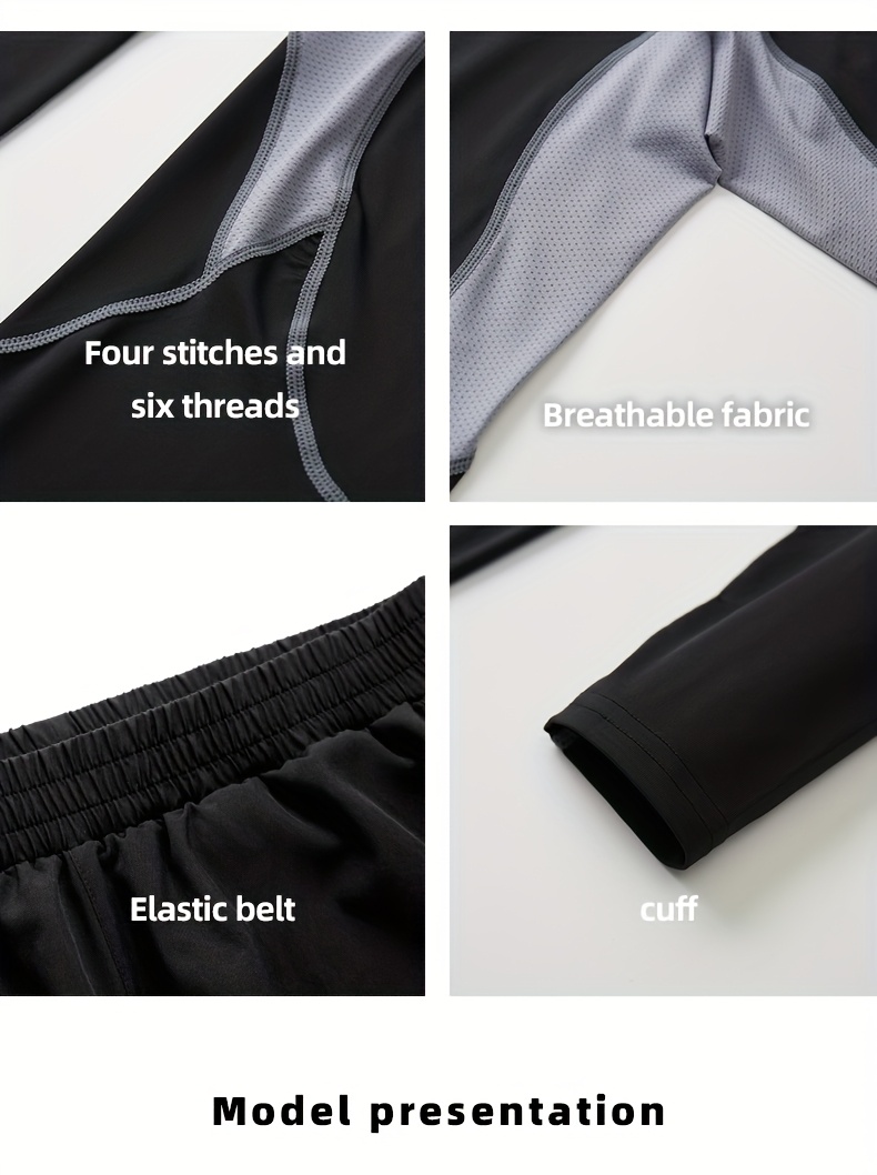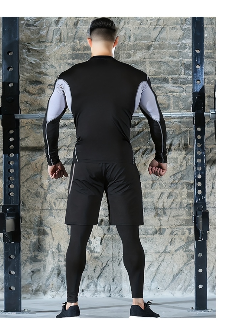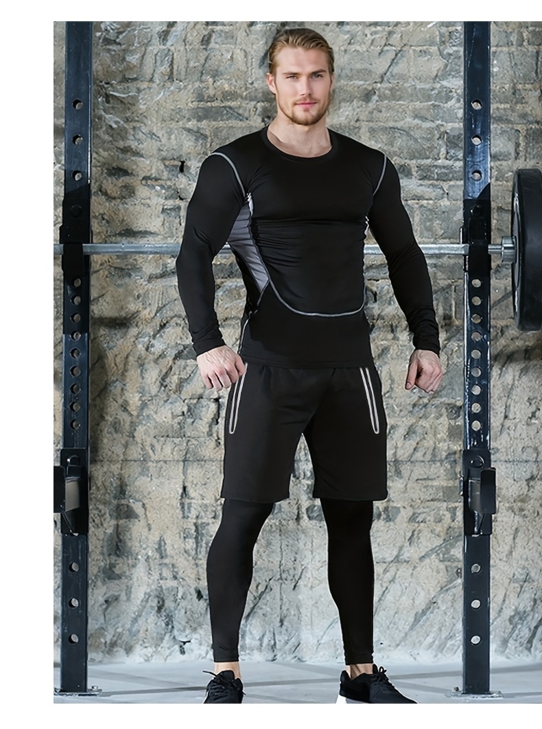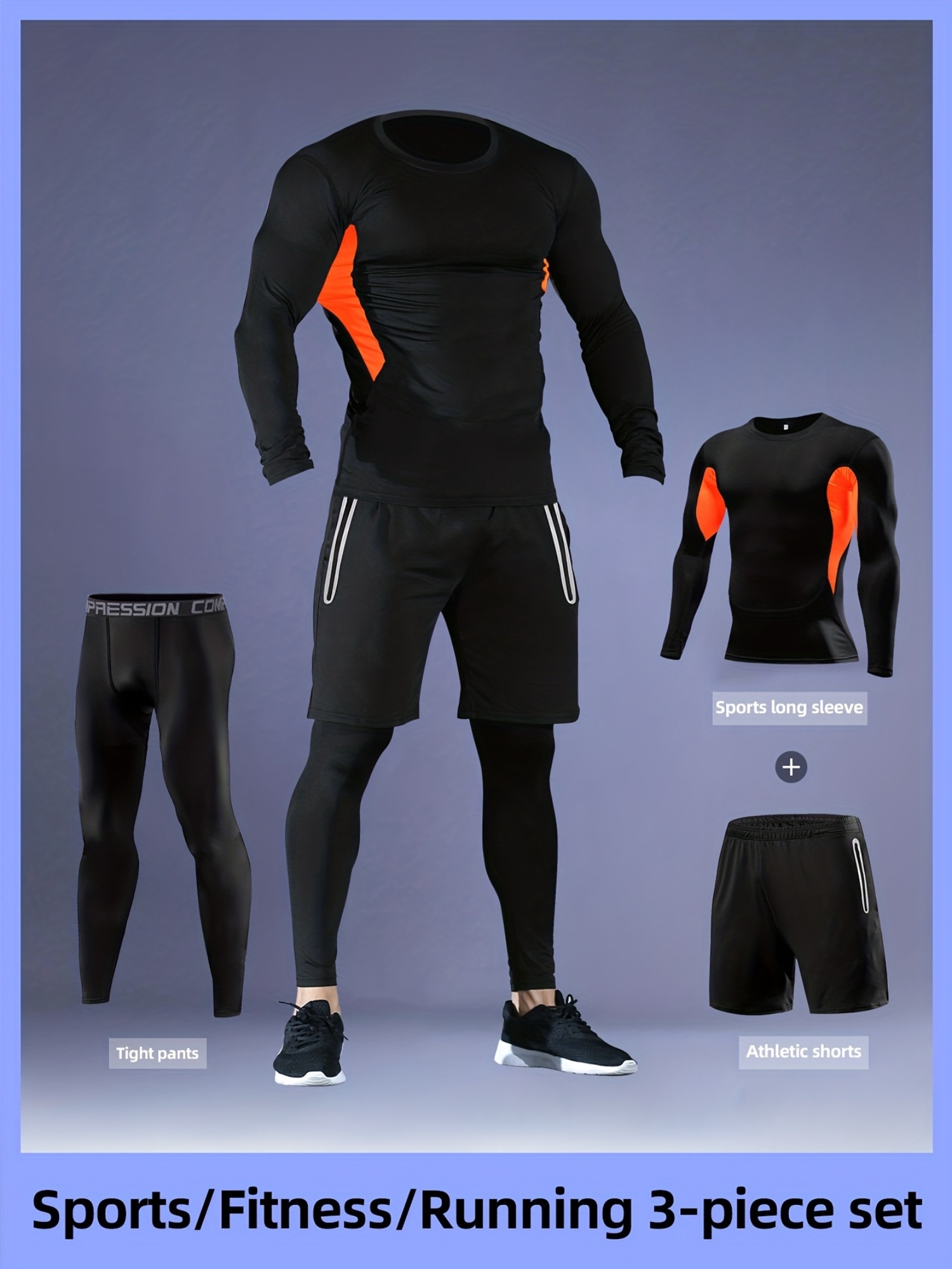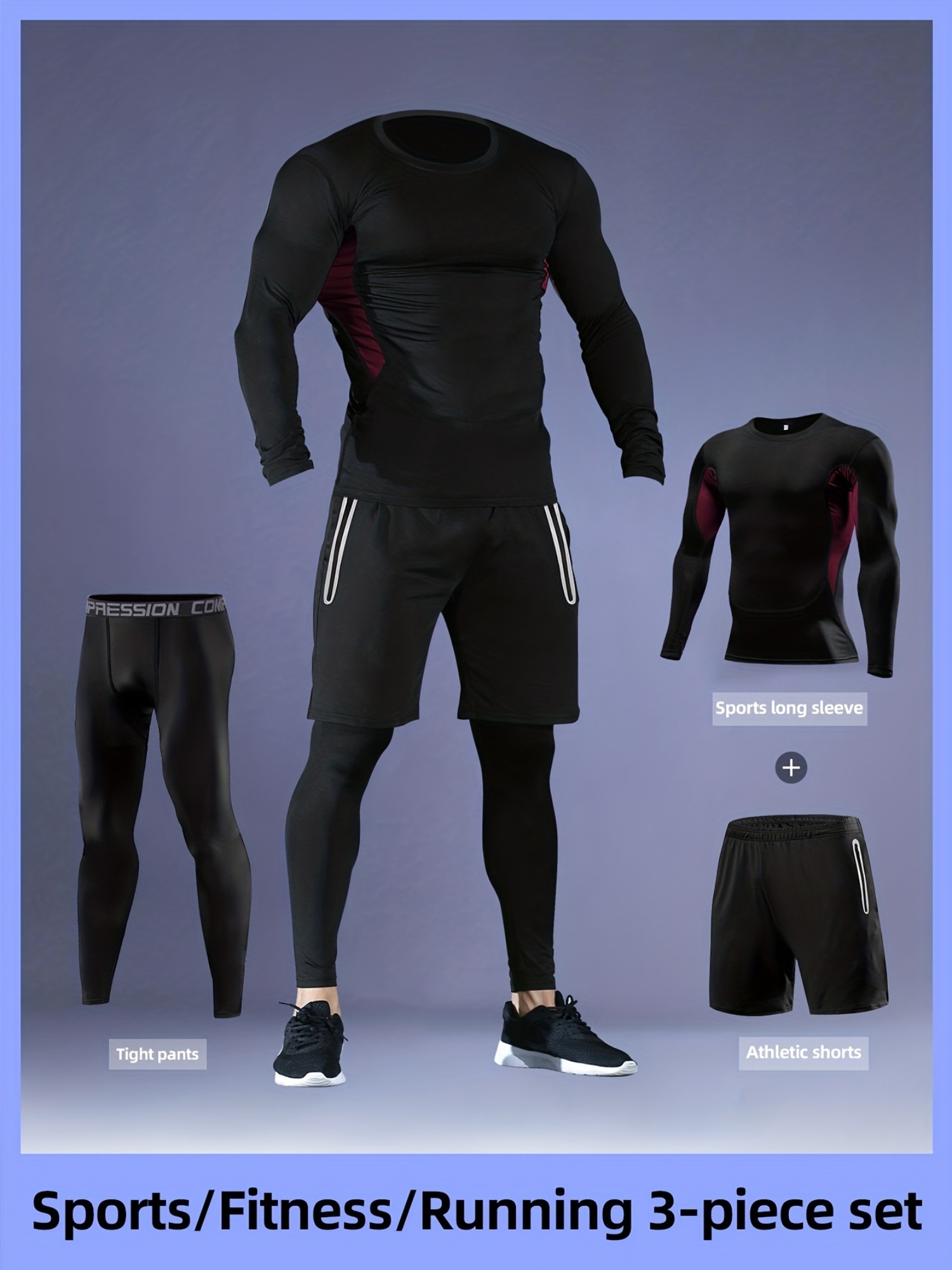 3pcs Men’S Athletic Workout Set – Breathable Mesh Long Sleeve & Leggings with Contrast Color Block, High-Stretch Gym & Running Outfit for Basketball, Training, Hiking – All-season Fitness Apparel, Workout Clothes, Basketball Gear