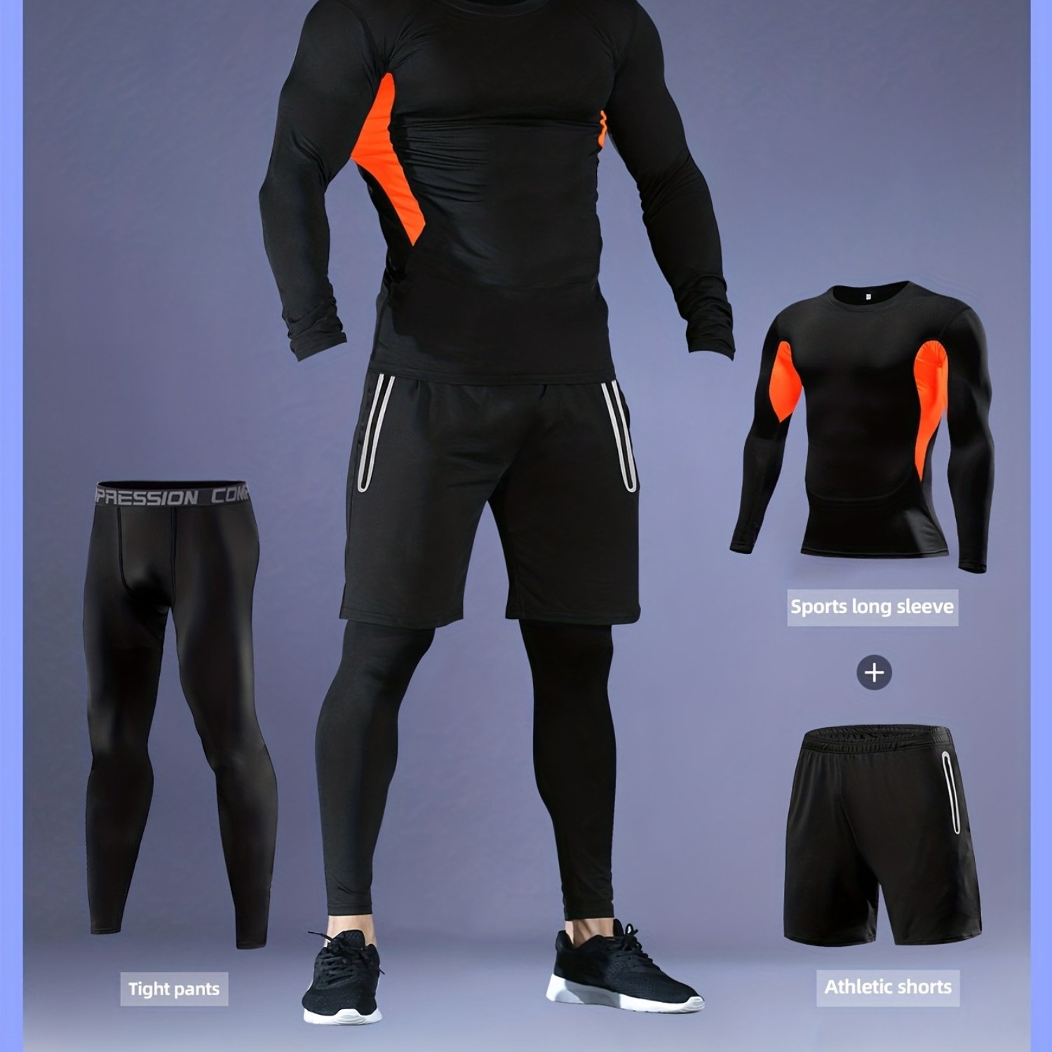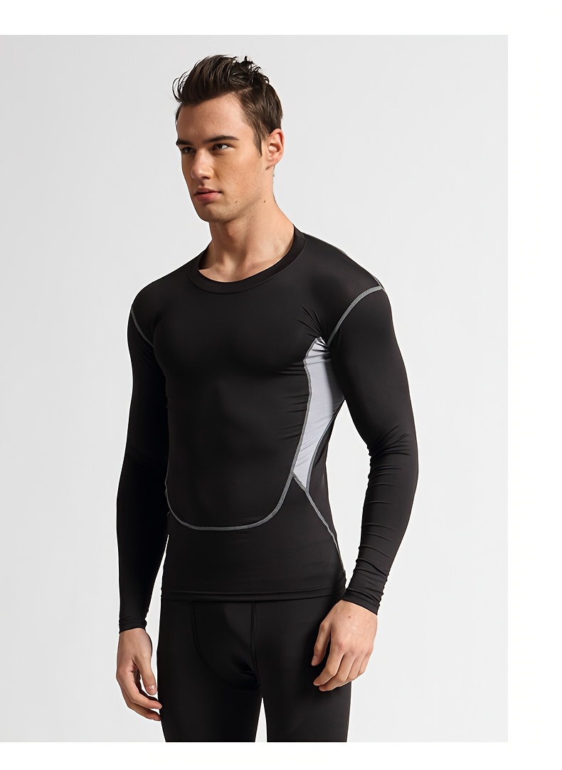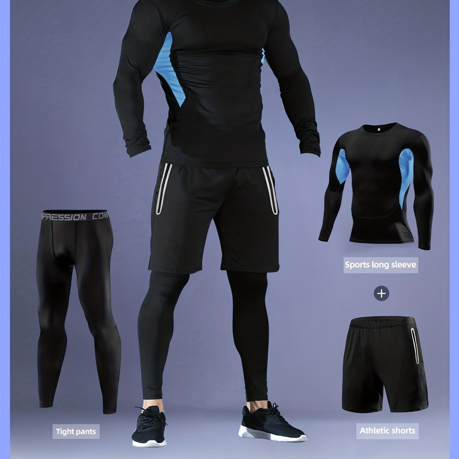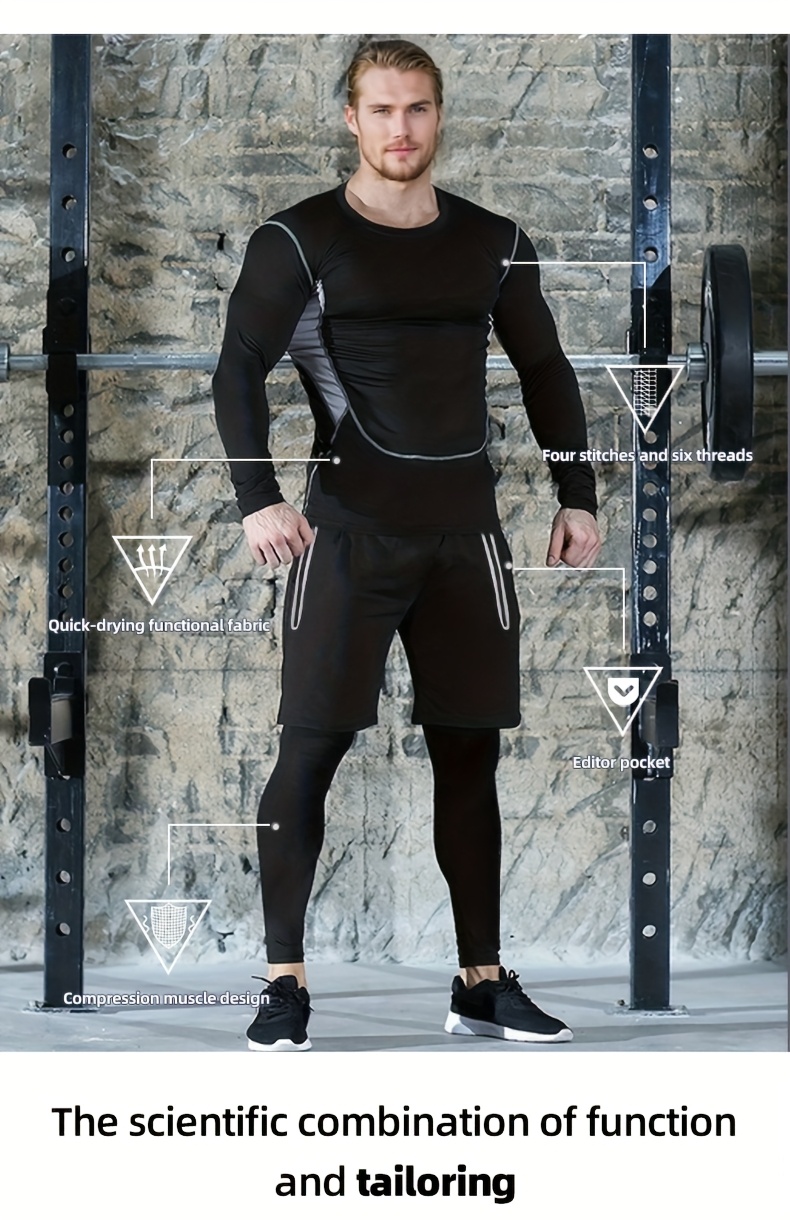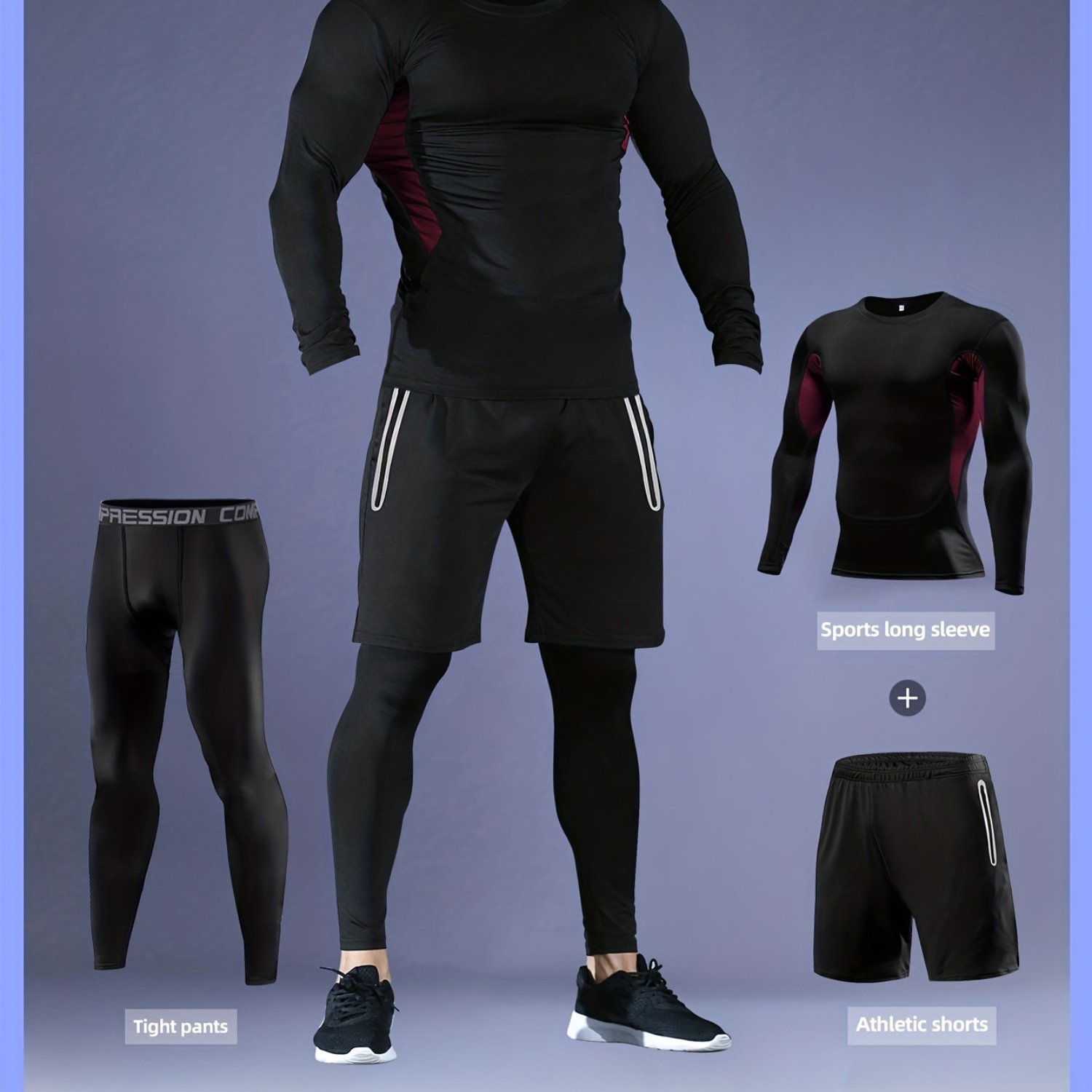3pcs Men’S Athletic Workout Set – Breathable Mesh Long Sleeve & Leggings with Contrast Color Block, High-Stretch Gym & Running Outfit for Basketball, Training, Hiking – All-season Fitness Apparel, Workout Clothes, Basketball Gear