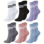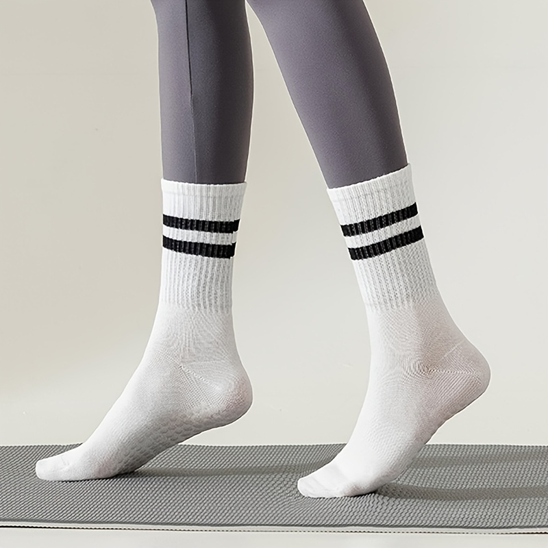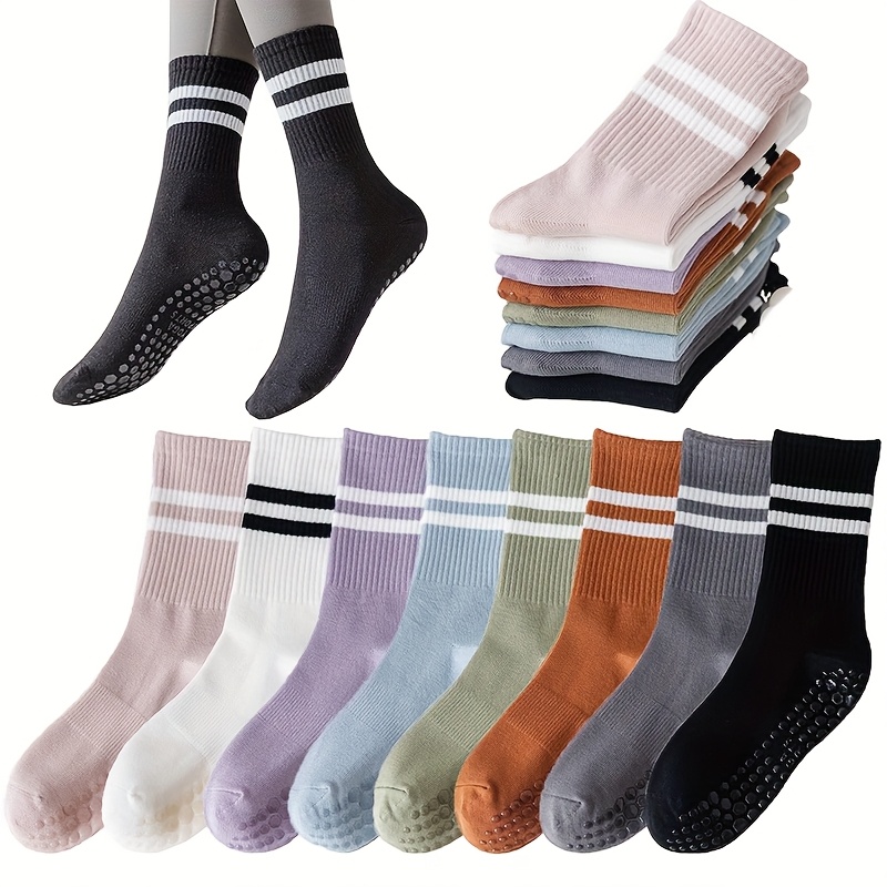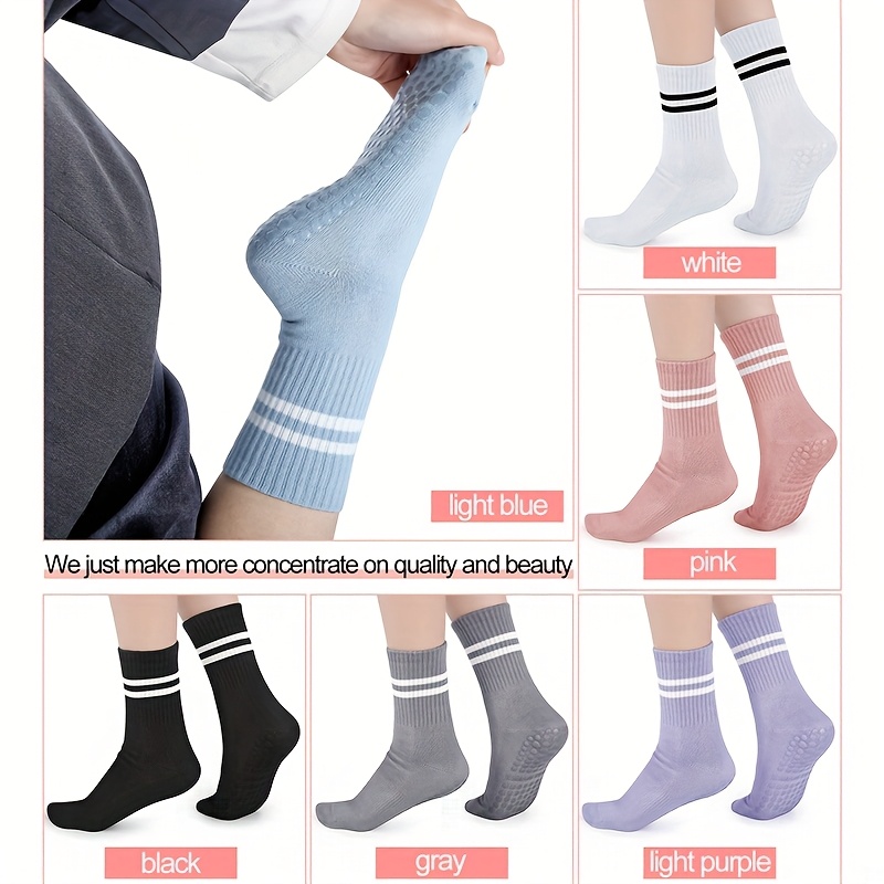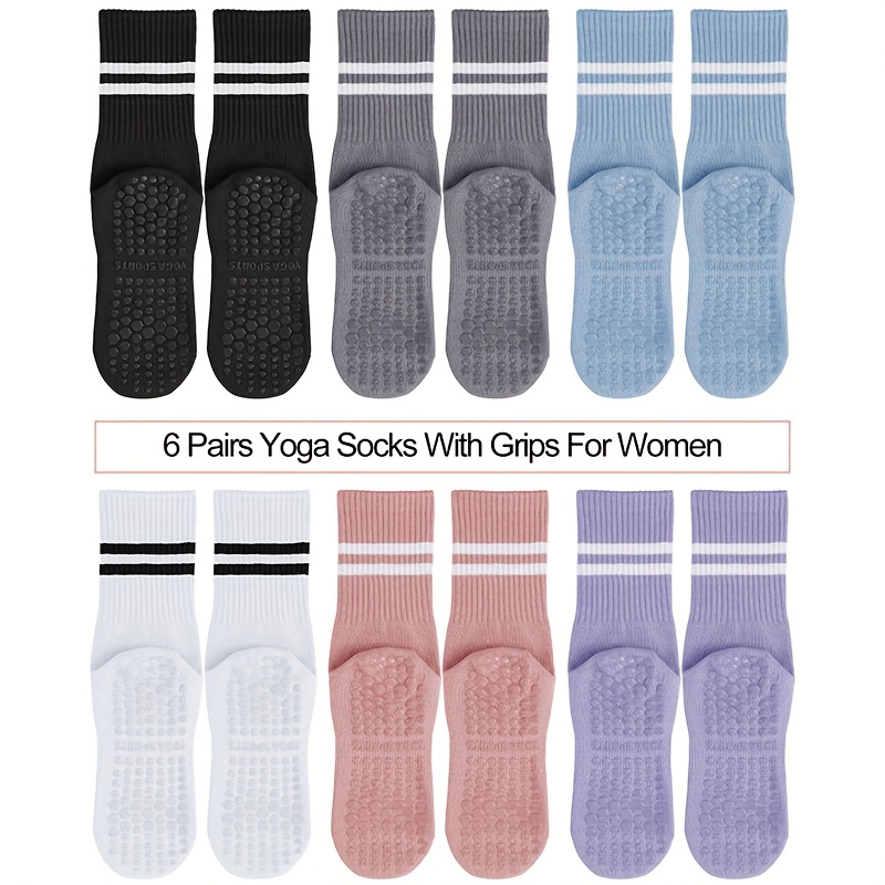 6 Pairs Women’s Anti-Slip Silicone Yoga Socks – Mid-Calf Length, Ribbed Texture with Double Stripe Design for Pilates, Dance, and Floor Fitness, Breathable Polyester Blend in Assorted Colors (White, Black, Purple, Gray, Pink, Blue), Floor Exercise Gear |
