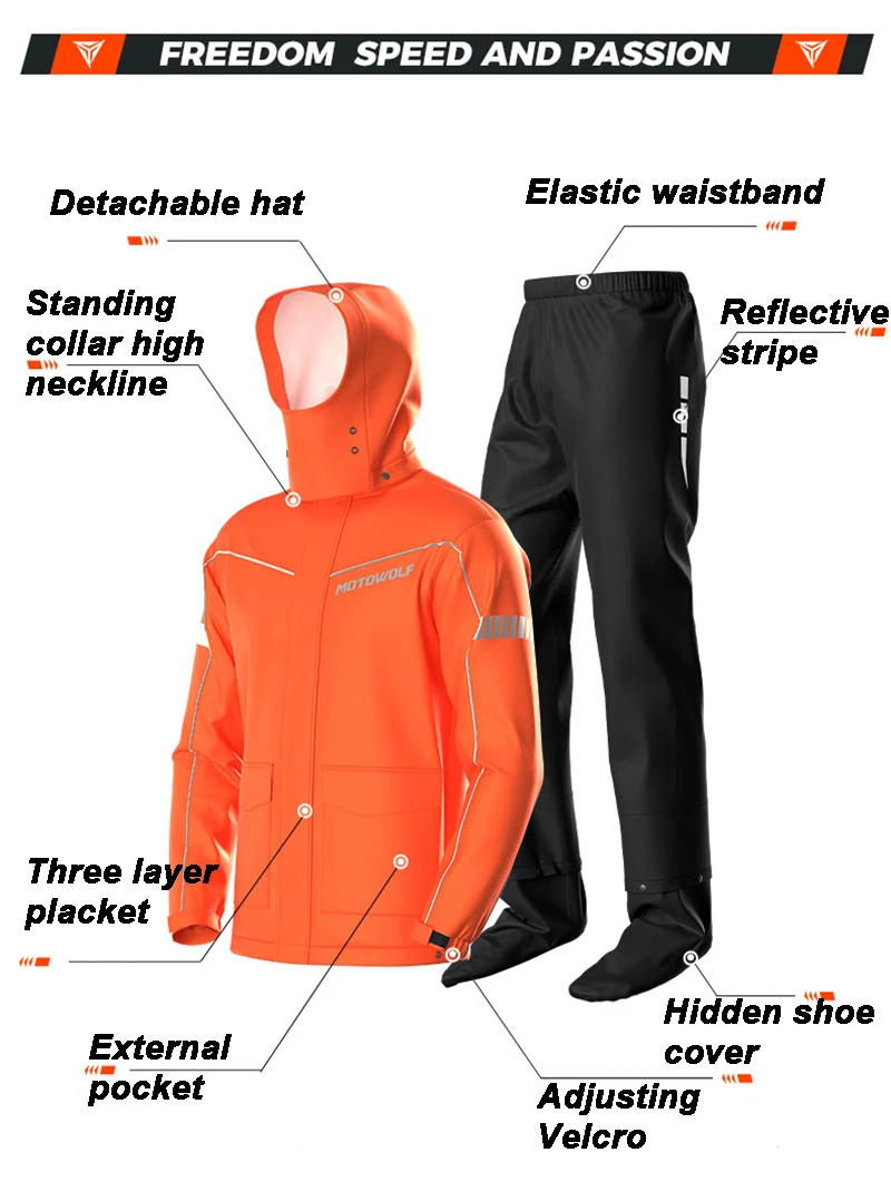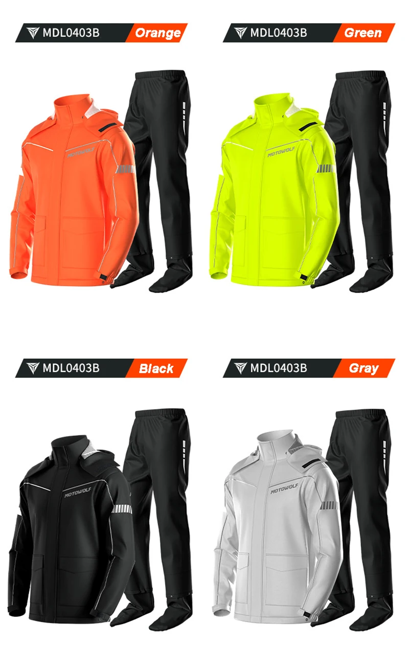 | Color | Orange Moto Rainsuit, Green Moto Rainsuit, Black Moto Rainsuit, Gray Moto Rainsuit |